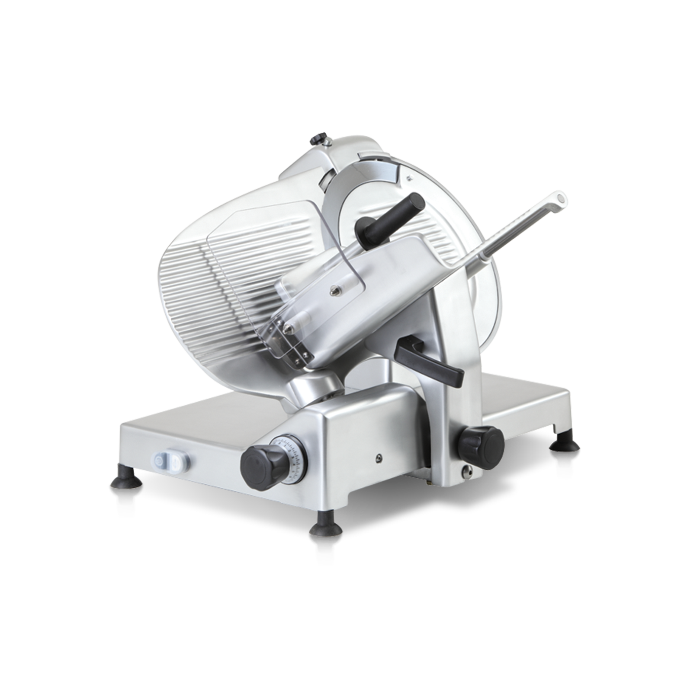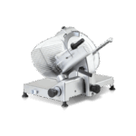 Slicers Professional gravity, ideal for cutting meats. Anodized cast aluminum alloy, belt drive, motor with thermal protection and forged blades made of hardened steel, sliding cart on self-lubricating bushings, aluminum holder plate with slip grooves, the standard flat-release system (CE version), sharpener built in cast aluminum. Available also with knobs completely in anodized aluminum (SILVER).
