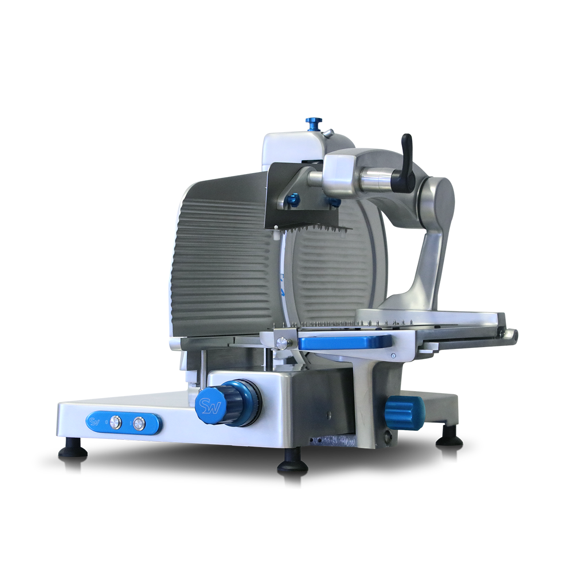 Anodized aluminum knobs, cast-in sharpener assembly with tray, s/ steel slice deflector, big and detachable grease guard, the wide gap between the blade and its shaft. Two-ways sliding feed plate, Armblock food grip with detachable meat grip, carriage release device and blade guard plate microswitch. IP67 controls. Optional: RAL colour painting.