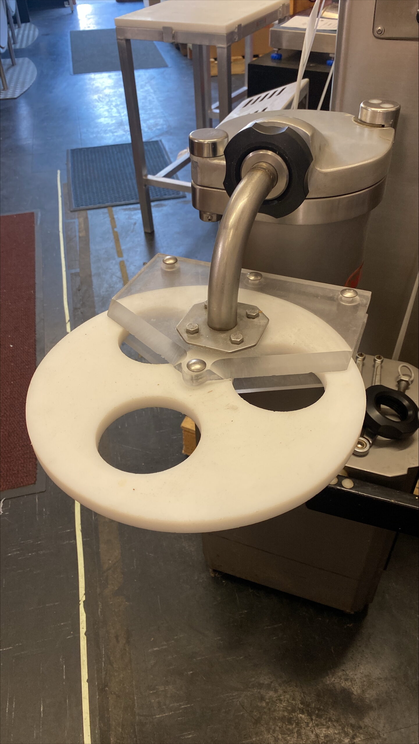 The burger former attachment replaces the standard nozzles on a Mainca sausage filler.